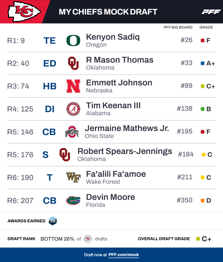 Travis Kelce is likely to retire after the season, though nothing has been announced. He had a generational career, even amassing 800+ yards in 2026 on his last legs. If he wants to comeback, the Chiefs will welcome him. Regardless, they should address the position. Kenyon Sadiq is one of most athletic tight end prospects we’ve seen in the 21st century. Trent McDuffie is a potential offseason trade candidate which would mean secondary is a huge focus for the Chiefs. They have a promising rookie corner in Nohl Williams but adding three guys with different skillsets (slot CB, box Safety & deep S/CB) gives their Hall of Fame defensive coordinator Steve Spagnuolo an army of versatility.