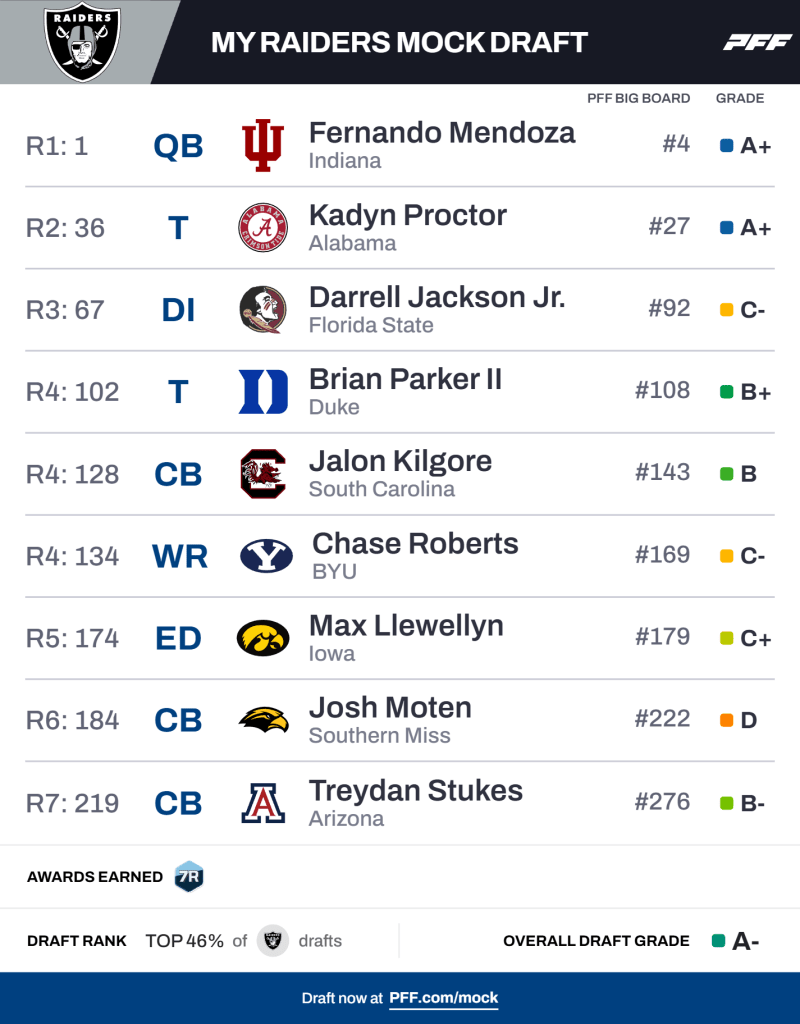 Focusing on the #1 overall pick, the Raiders are essentially choosing between Fernando Mendoza (taken in this mock) and Oregon Dante Moore. It will be the great offseason quarterback debate of 2026. Beefing up the interior on both sides of the ball is critical for Vegas, and upgrading the secondary is the next highest priority. With endless holes to fill, they’ll need to hit on both the QB and in the middle rounds to turn their tides around.