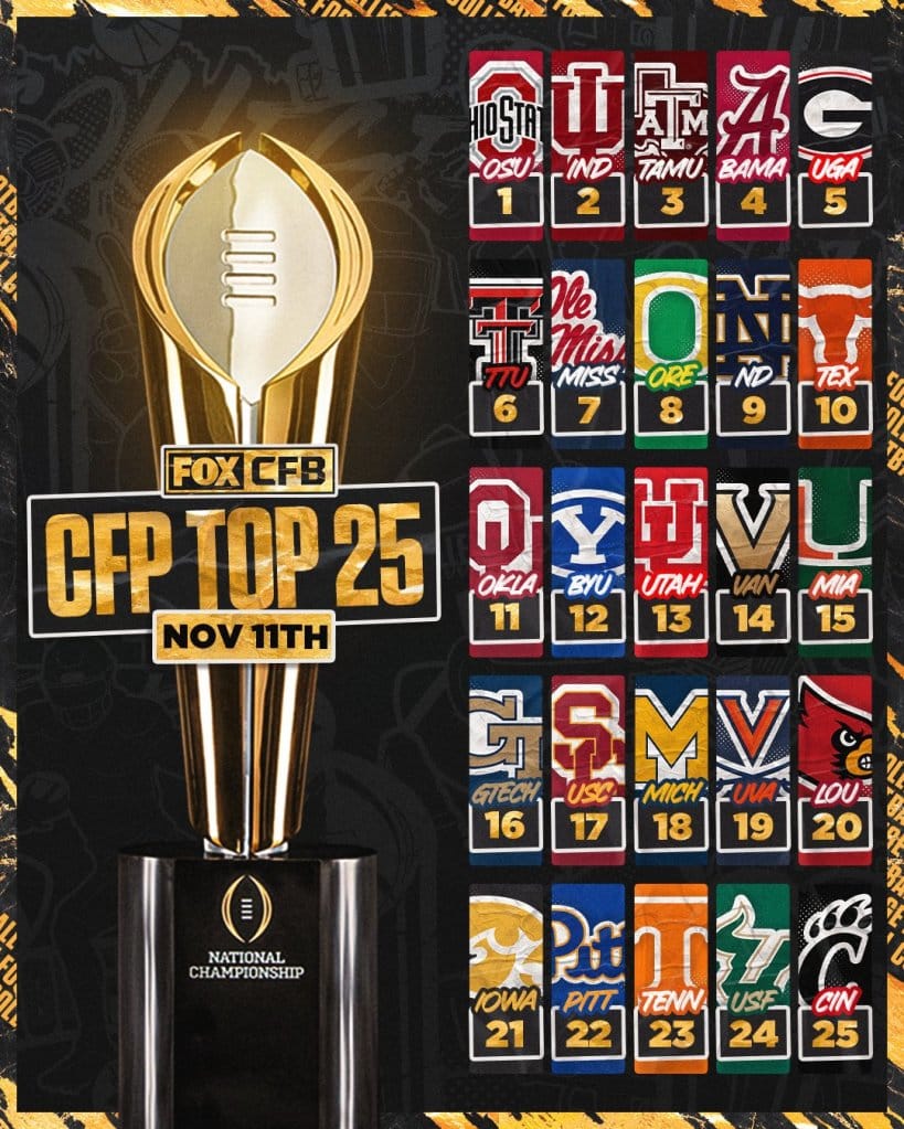 Here are the updated CFP Top 25. I’m seeing so much red at the top. The top 6 teams are all red!!! I’ve been saying that.