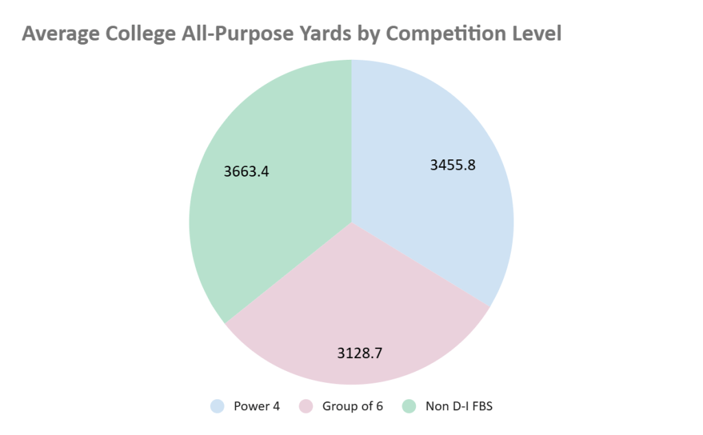 No surprise here. Non-FBS players have more All-Purpose yards in college than both Power-4 and Group of 6 players. The surprising number comes from the 500+ yard difference in All-Purpose yards between non-FBS players and Group of 6 players.