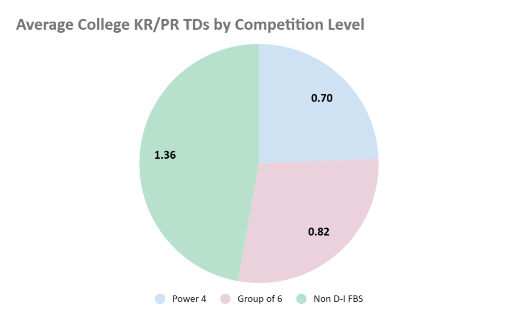 What seems to be at least somewhat correlated is the number of TOTAL punt/kick return touchdowns a player has in college. You can see that players outside the Power-4 conferences averaged 1.1 total touchdowns compared to 0.7 for the Power-4 players.