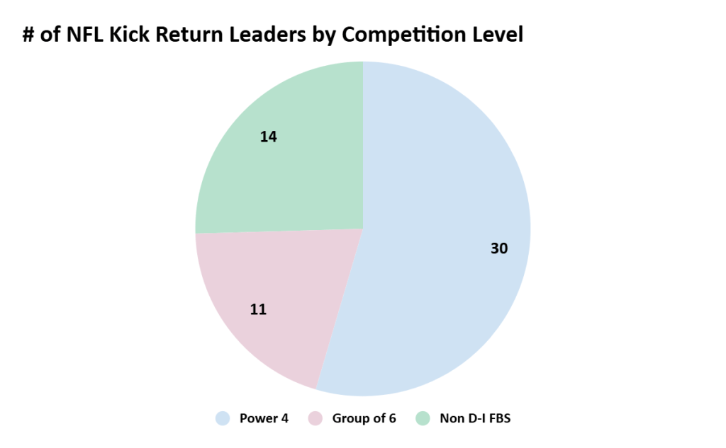 The thing that sticks out to me most from this data is that nearly half of the top-55 kick returners in the NFL come from outside the Power-4 level with 1 in every 4 coming from outside Division-1 FBS competition. How does this correlate into NFL success as a kick returner, and was their collegiate success an indicator of their success in the NFL?