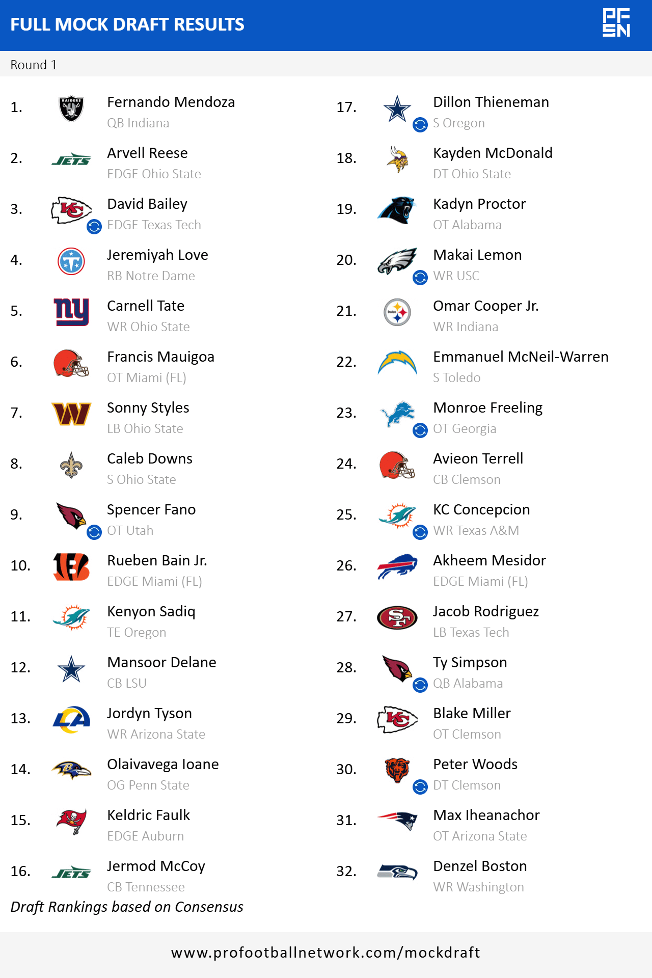 I’m not going to go super in depth on this, but I was experimenting with some trades in my recent mock. If the Jets don’t take Bailey (unlikely at this point imo), could Kansas City move from 9 to 3 to get a pure edge rusher which is a huge need? What about Dallas? It’s clear they want to move up but is that from 12 to inside the top 10, or is that from 20 up a few spots to make sure they get their guy? Do the Eagles need to move up to find an AJ Brown replacement? Could Miami make a move up above their division rival Buffalo to secure a pass catcher? Will Arizona or another team trade back into the first to select Ty Simpson?